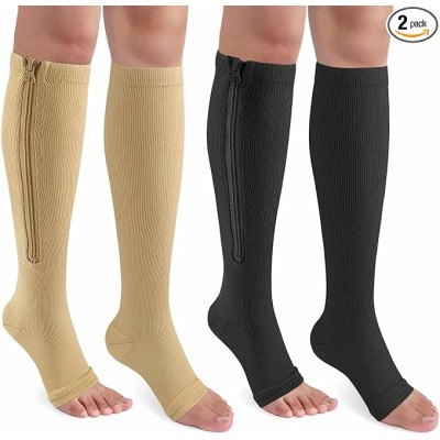 2 Pairs Zipper Compression Socks for Women & Men, 15-20 mmHg Open Toe Knee High Support Socks for Varicose Vein Edema